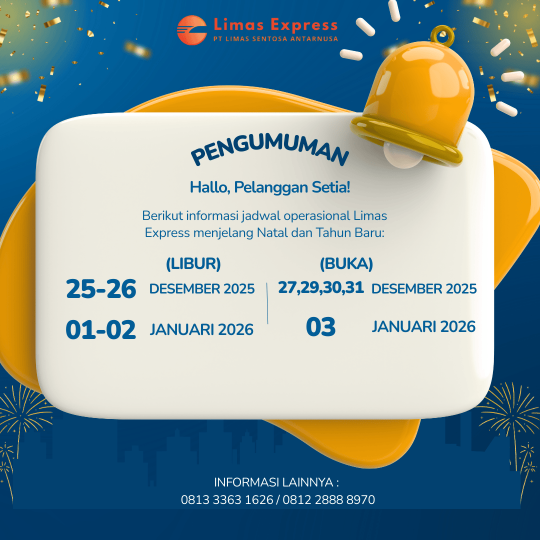 Menyambut momen Natal 2025 dan Tahun Baru 2026, Limas Express berkomitmen untuk tetap memberikan pelayanan pengiriman yang optimal kepada seluruh pelanggan. Agar proses pengiriman barang Anda berjalan lancar dan terencana, kami menyampaikan informasi penting terkait jadwal operasional Limas Express selama periode libur akhir tahun.